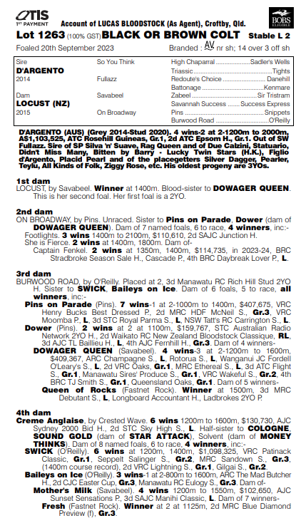 This colt was a must have from the moment he was led out to parade for us. By Rosehill Guineas winner D’Argento, out of a Savabeel mare, he rated A+++ the highest rating on our breeding system. He is bred on the same cross as prolific black type performer So Si Bon and he looks a lot like that horse. This bloke is eligible for both QTIS and BOBS bonus systems which gives us plenty of options.